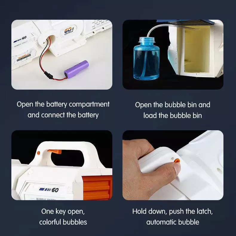 • 360° Rotating Bubble Action: With 60 holes, this bubble gun creates a breathtaking, multi-directional bubble storm, ensuring no shortage of fun.