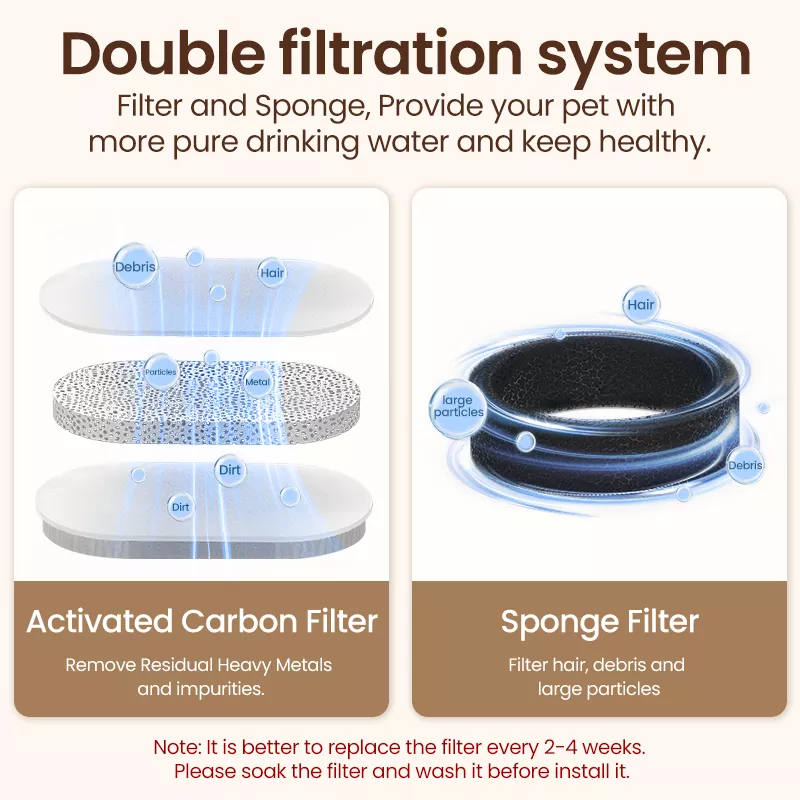 This innovative water fountain combines functionality with premium materials, ensuring long-lasting use and optimal performance. Crafted from durable SUS304 stainless steel and ABS, it’s easy to clean, rust-resistant, and safe for your pets. The built-in carbon and sponge filters effectively purify the water, removing impurities and odors to encourage your pets to drink more often.