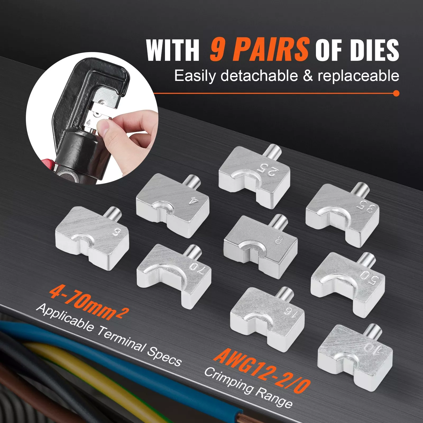 • Comprehensive Die Set – Comes with 9 pairs of dies covering AWG sizes from 12 to 2/0, giving you the flexibility to handle a variety of cable and terminal sizes.