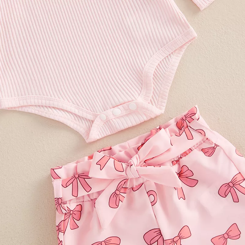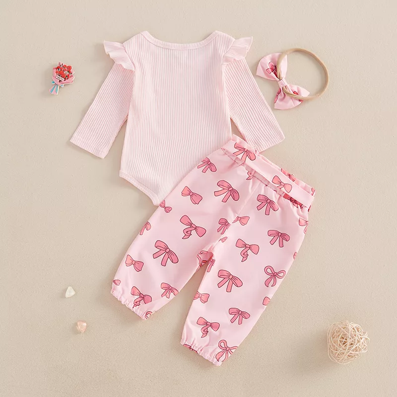 - Complete Set: Includes a long-sleeve ribbed romper, bow-print elastic pants, and an adorable matching headband.