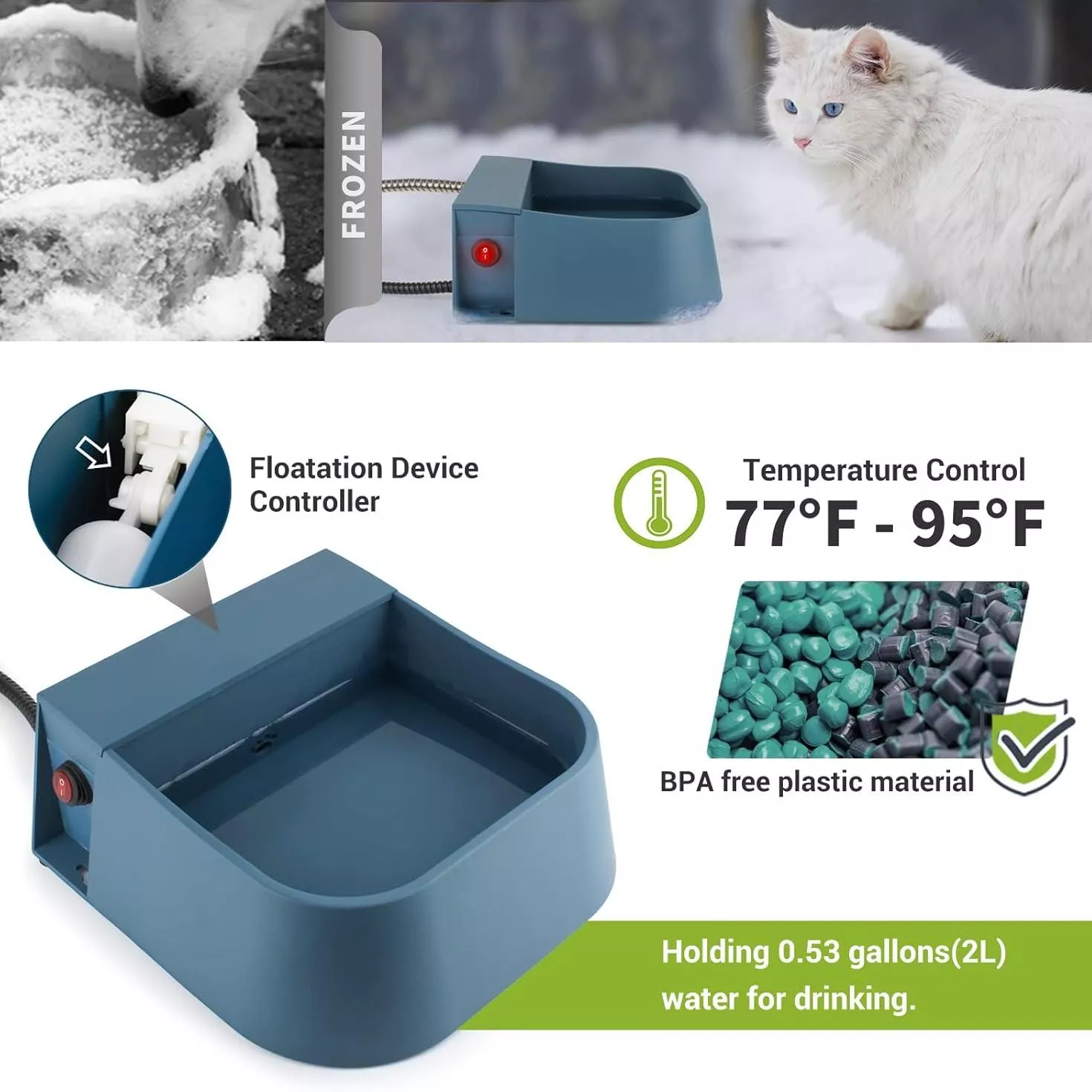 - Heated Design: The built-in heating element prevents water from freezing during the winter, providing continuous hydration even in freezing temperatures. No more worrying about frozen water bowls in the cold weather!