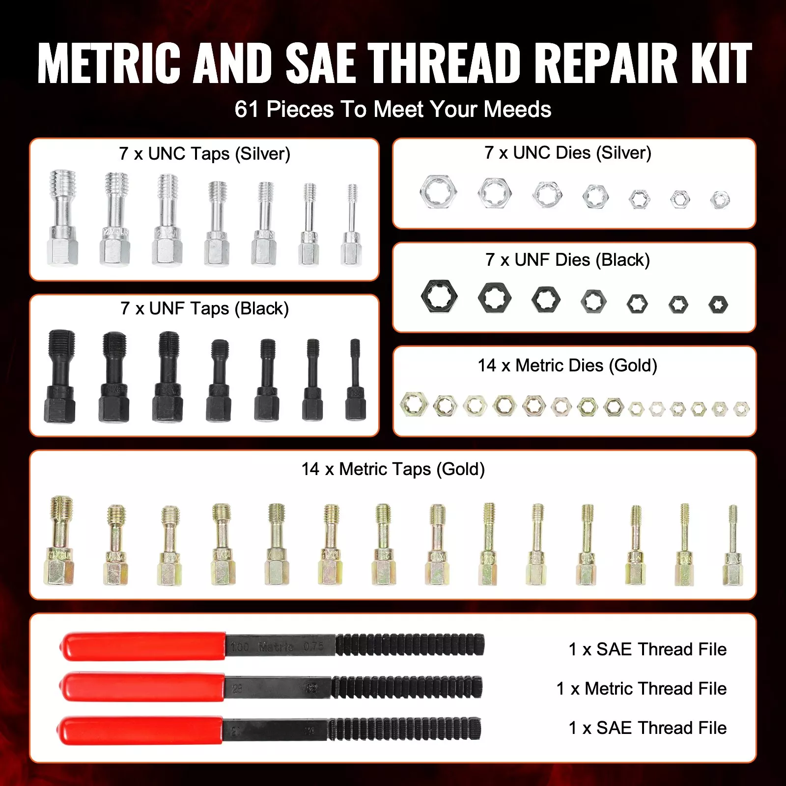- Comprehensive 61-Piece Set – Includes 28 taps, 28 dies, and 3 color-coded thread files to match various thread sizes and types (UNC, UNF, Metric).