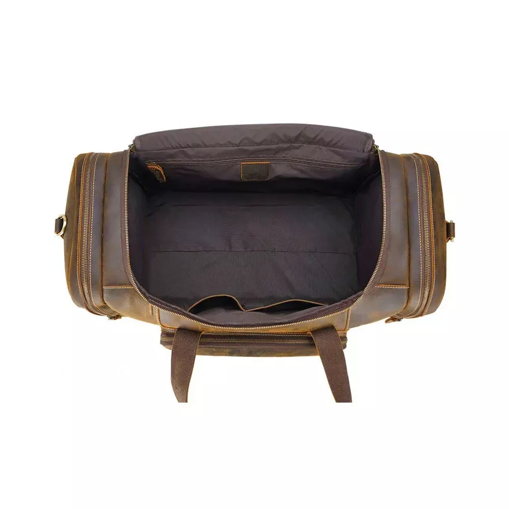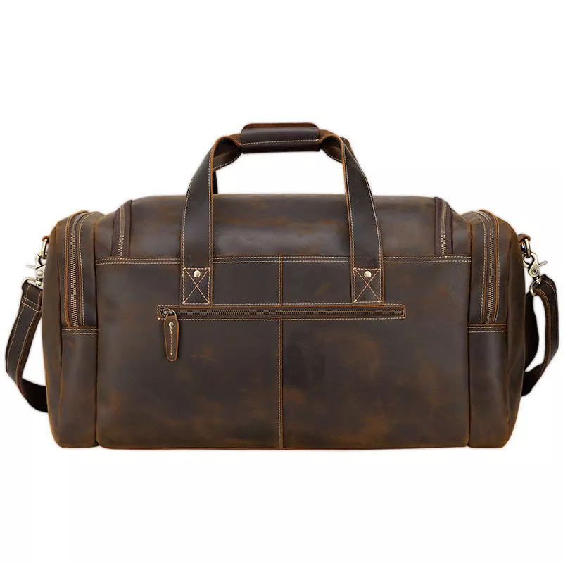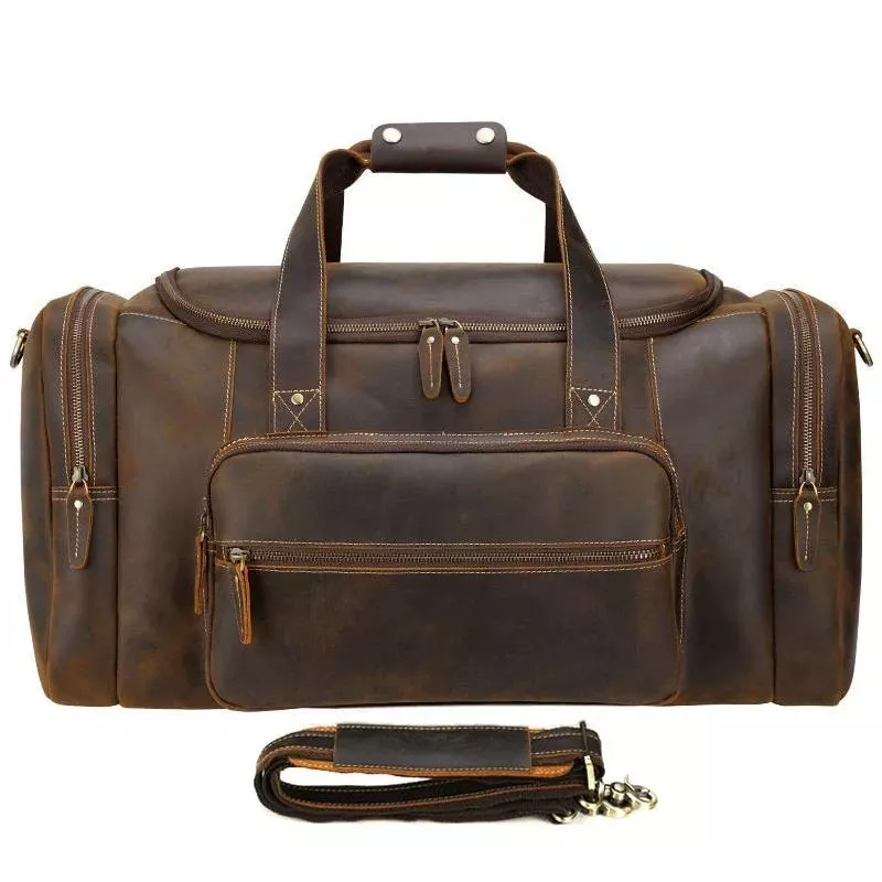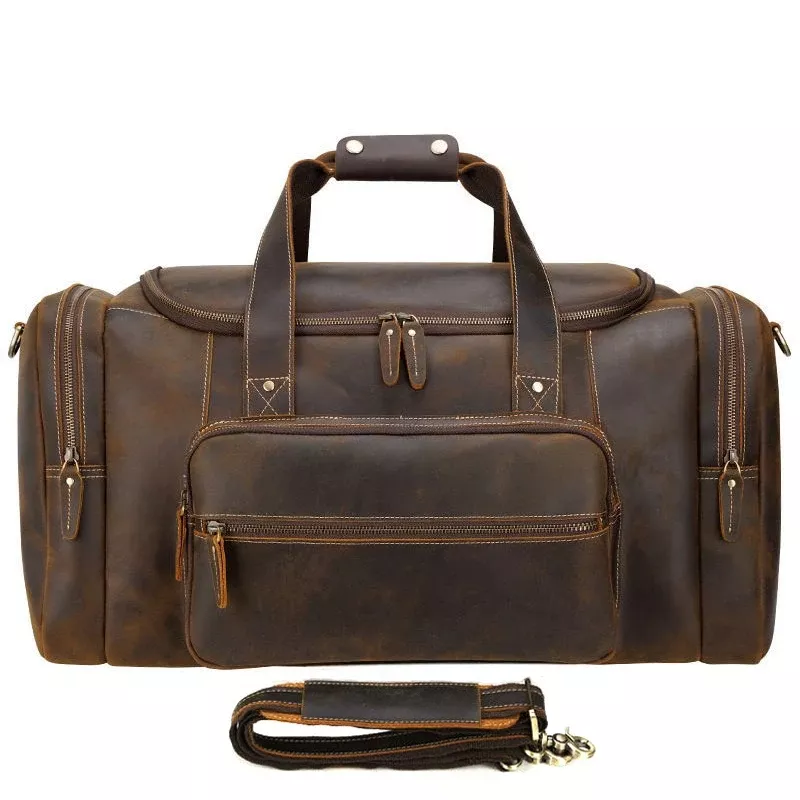 What sets this leather duffel apart from others is its timeless appeal and exceptional craftsmanship. Made from premium full grain crazy horse leather, the bag not only offers a vintage aesthetic but also ensures durability and long-lasting use. Unlike other travel bags, the more you use it, the more unique it becomes, developing a beautiful patina that tells the story of your travels. The generous size and multiple compartments allow you to stay organized, while the sturdy leather handles and detachable shoulder strap provide multiple ways to carry it in comfort. Whether you’re heading on a weekend trip or need an all-purpose bag for your busy life, this leather duffel bag will serve you well for years to come.