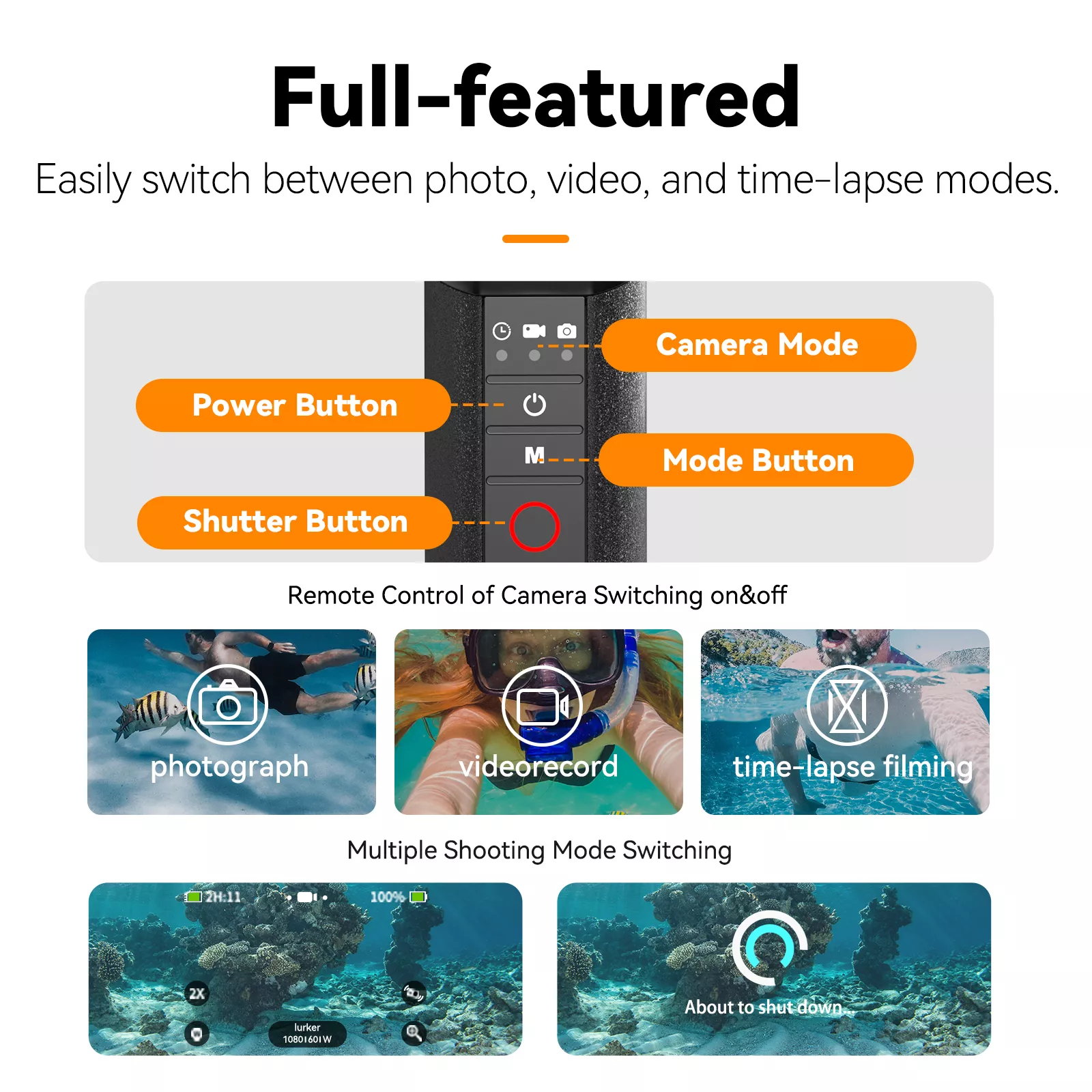 Designed with both functionality and adventure in mind, this selfie stick combines durable waterproof materials with a sleek, lightweight design. Compatible with GoPro Hero 8, 9, 10, 11, and 12, it includes a wireless remote control that simplifies your shooting experience, letting you switch effortlessly between photo, video, and time-lapse modes. Dive up to 49 feet and create unforgettable underwater memories—all with single-handed ease.